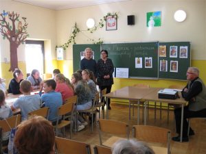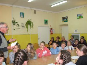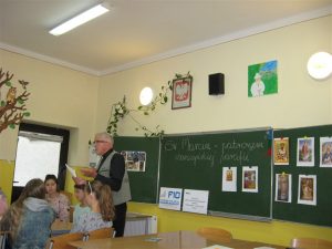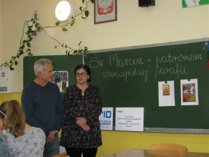 Jednym z zadań w projekcie „Przez stulecie pod wspólnym niebem. Zarszynianie – życie, praca i wiara” realizowanym przez Stowarzyszenie INICJATYWA w Zarszynie były spotkania uczniów i seniorów z księdzem zarszyńskiej parafii nt. życia Świętego Marcina. Zaproszenie do udziału w nich przyjął ksiądz kanonik Antoni Obłoza. Spotkania poprowadzili członkowie stowarzyszenia Anna Szałankiewicz i Józef Kasza. Jedno z nich odbyło się w świetlicy szkolnej 25 września 2018 r. z dwudziestoosobową grupą uczniów, którzy w tym dniu rozpoczynali warsztaty plastyczne z malowania postaci Św. Marcina. W spotkaniu uczestniczyli również seniorzy, którzy z zaciekawieniem, podobnie jak uczniowie, wysłuchali opowieści o życiu Św. Marcina. Ksiądz Obłoza przedstawił życie świętego w kilku odsłonach: jako rzymskiego legionistę, mnicha pustelnika i biskupa Tours. Uwrażliwiał dzieci i młodzież na dzielenie się z biednymi i potrzebującymi nawiązując do zdarzenia z życia Marcina, który zimą, gdy napotkał półnagiego żebraka, oddał mu połowę swojej żołnierskiej opończy. Nie zabrakło również tematów związanych z gęsiną i rogalami oraz przysłowiami o Św. Marcinie. Dodatkowo zebrani otrzymali od prowadzących spotkanie wiedzę nt. jak w ikonografii przedstawiany jest święty, jakie atrybuty są do tej postaci przypisane oraz czyim jest patronem.