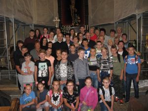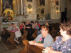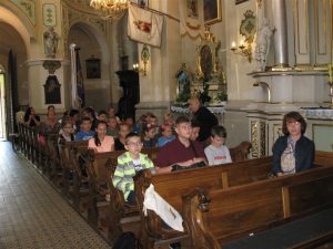 Już na początku podróży doszło do integracji. Po zapoznaniu uczestników z celami wyjazdu, śpiewaliśmy piosenki, rozmawialiśmy, a ks. Antoni Obłoza przybliżył nam postać św. Marcina. Piękna, słoneczna pogoda, a także atmosfera w autobusie sprawiły, że droga nam bardzo szybko minęła i – po wcześniejszym umówieniu się na wizytę z tamtejszym księdzem proboszczem – przed godz. 10.00 weszliśmy do pięknego kościoła z 1760 r. Zauważyliśmy, że jego wnętrze – podobnie jak w Zarszynie – jest w remoncie. O historii tego miejsca i trwających pracach odnowienia polichromii opowiedział nam ks. proboszcz Sławomir Nowak. Z uwagą słuchaliśmy opowieści o tym, że podczas II wojny światowej wnętrze kościoła zostało zdewastowane, a jedynie oryginalna jest posadzka, drzwi wejściowe i drewniana chrzcielnica, w stylu rokokowym, polichromowana, złocona, z piękną snycerką. Jest ona najcenniejszym sprzętem zachowanym z dawnego wyposażenia świątyni. To przy niej został ochrzczony późniejszy metropolita krakowski kardynał Adam Sapieha. Dowiedzieliśmy się, że dwa boczne ołtarze i ambona pochodzą z kościoła w Dubiecku, ołtarz główny wykonano w 1954 r. wg projektu Stanisława Kochanka z Krosna, w warsztacie F.M. Paśków w Przemyślu, a zabytkowa szafa na organy była dawniej częścią organów z kościoła Bernardynów w Przeworsku. Nie zobaczyliśmy natomiast obrazu z wizerunkiem św. Marcina, bowiem ze względu na trwające prace przy odnawianiu polichromii na ścianach został on zdjęty i jest w przechowaniu. Żegnając ks. proboszcza krasiczyńskiej parafii, podziękowaliśmy za miłe przyjęcie naszej grupy i zaprosiliśmy do odwiedzenia naszej parafii i zarszyńskiego kościoła. Podarowaliśmy również monografię Zarszyna i Posady Zarszyńskiej, a także ostatni numer „Głosu Zarszyna”.