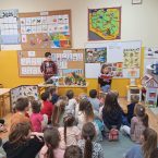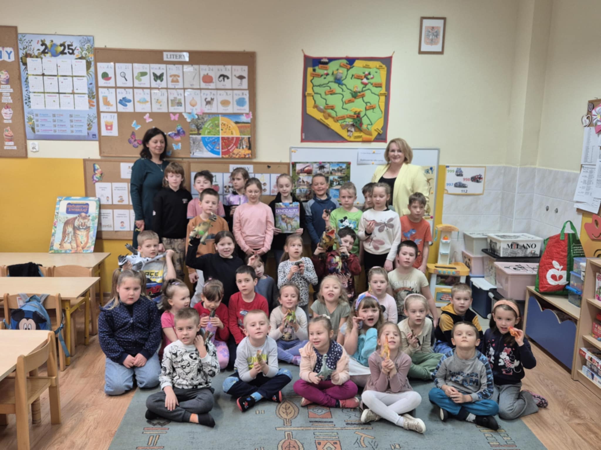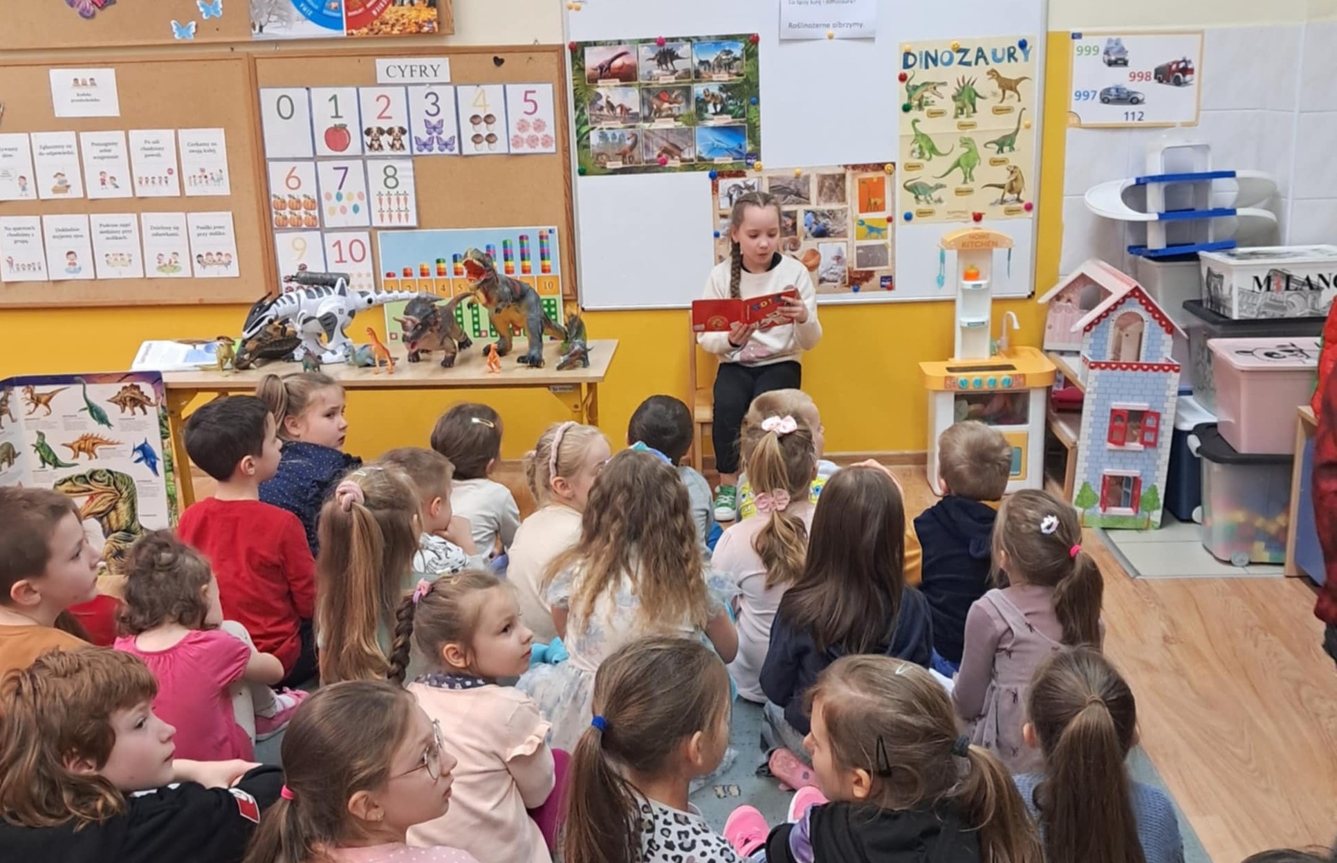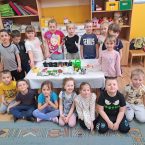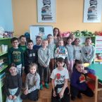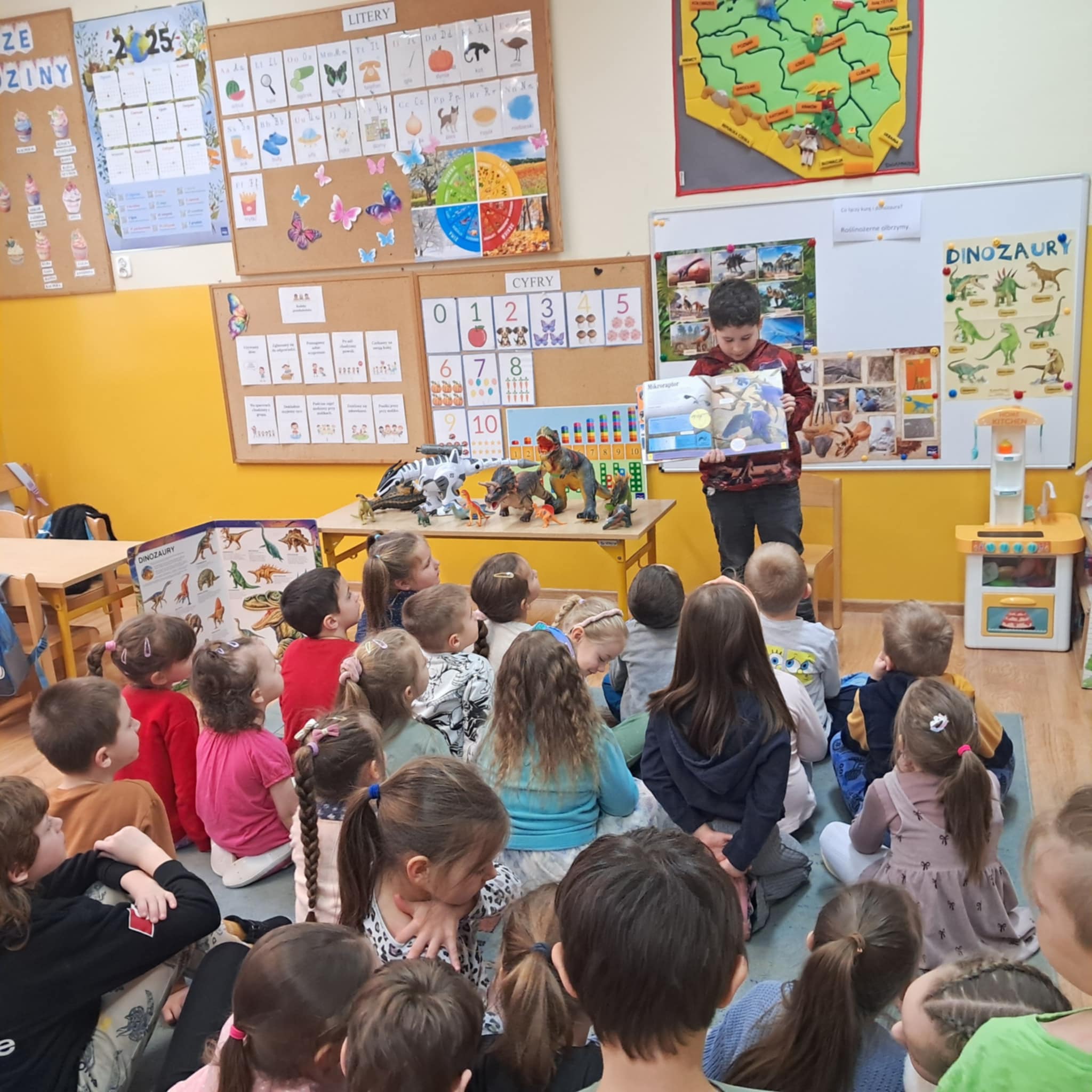 W dniu 27 marca 2025 r. uczniowie klasy 1 odwiedzili grupę przedszkolną 0b, aby przeczytać młodszym kolegom i koleżankom krótkie bajki o dinozaurach. Dzieci z przedszkola z ogromnym zainteresowaniem słuchały starszych kolegów. Spotkanie miało na celu budowanie pozytywnych relacji między dziećmi w różnym wieku.