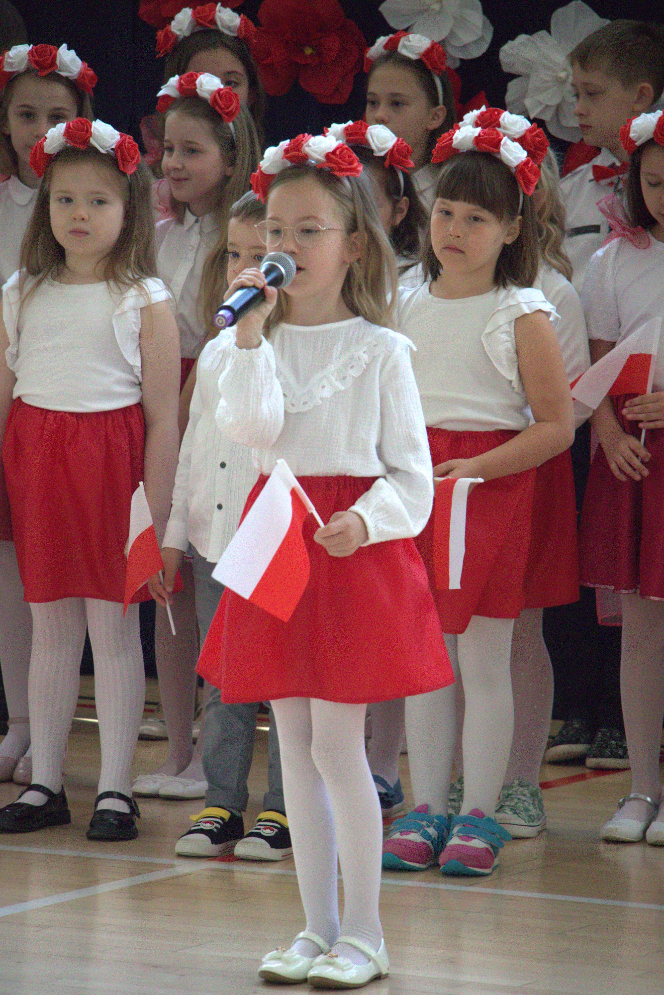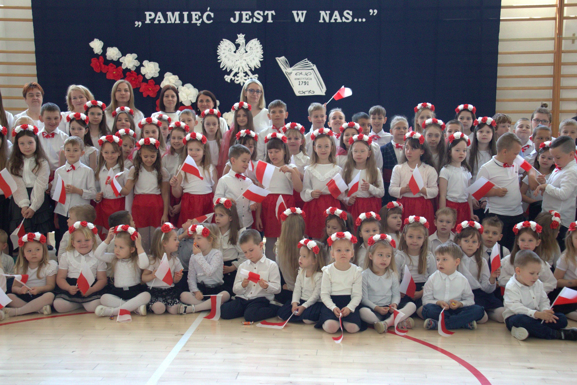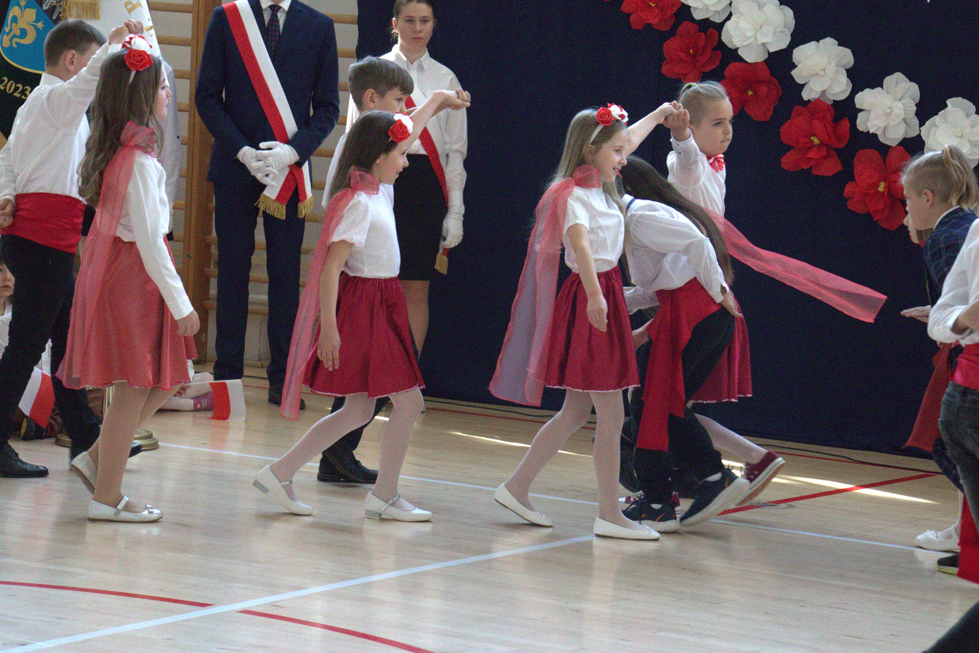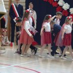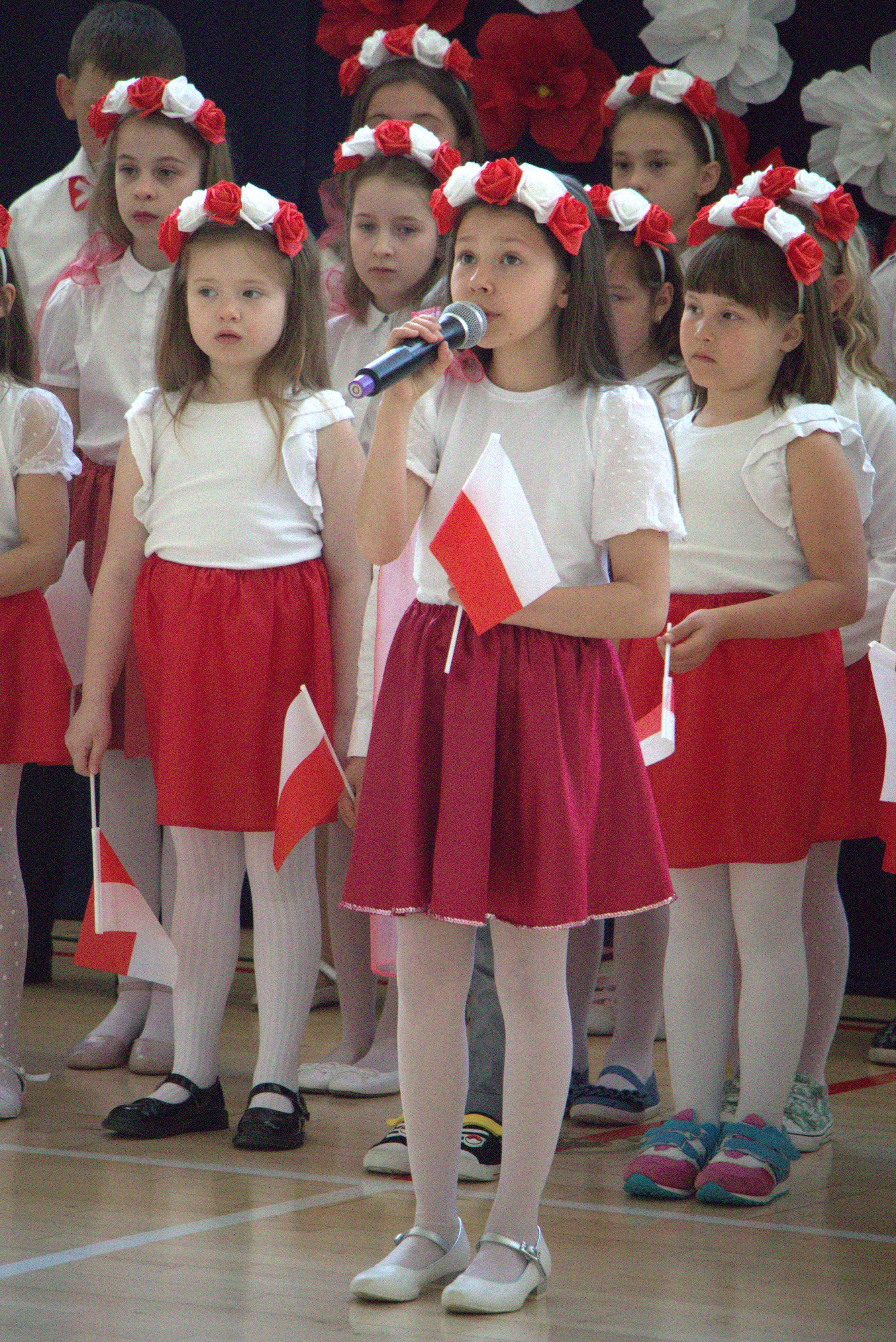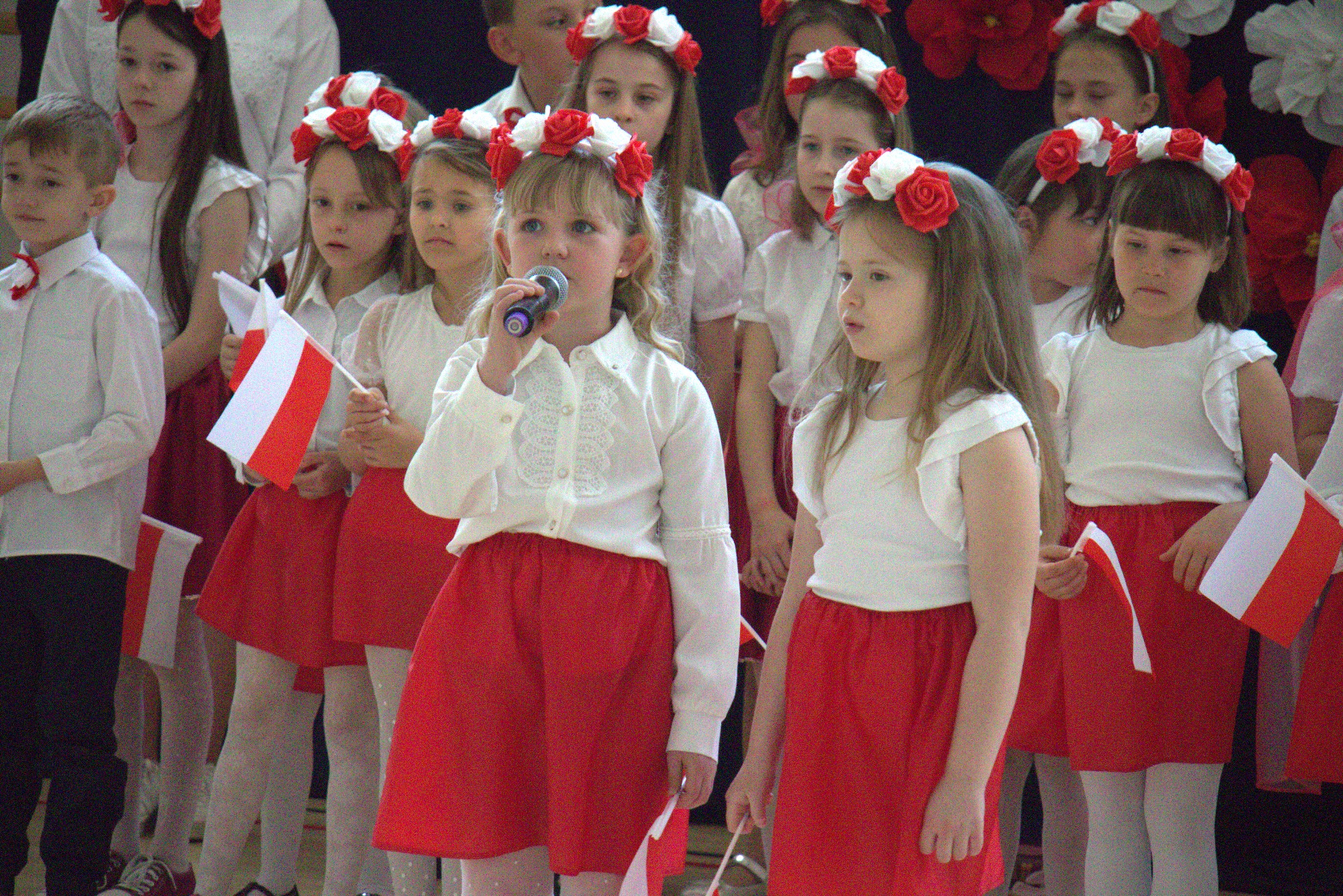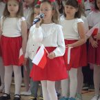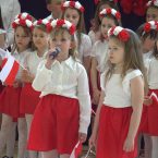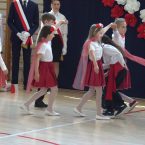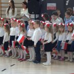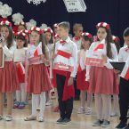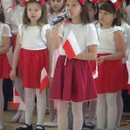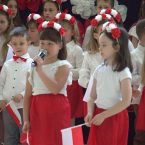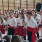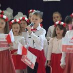 Uczniowie młodszych klas i dzieci z oddziałów przedszkolnych w pięknych strojach z biało – czerwonymi chorągiewkami w ręku demonstrowali swój patriotyzm. Młodzi artyści zaprezentowali wzruszający program artystyczny, w trakcie którego nie zabrakło tematycznych wierszy, wymownych piosenek oraz wspaniale odtańczonego poloneza. Była to niezwykła lekcja historii oraz świadectwo świadomości patriotycznej młodego pokolenia.