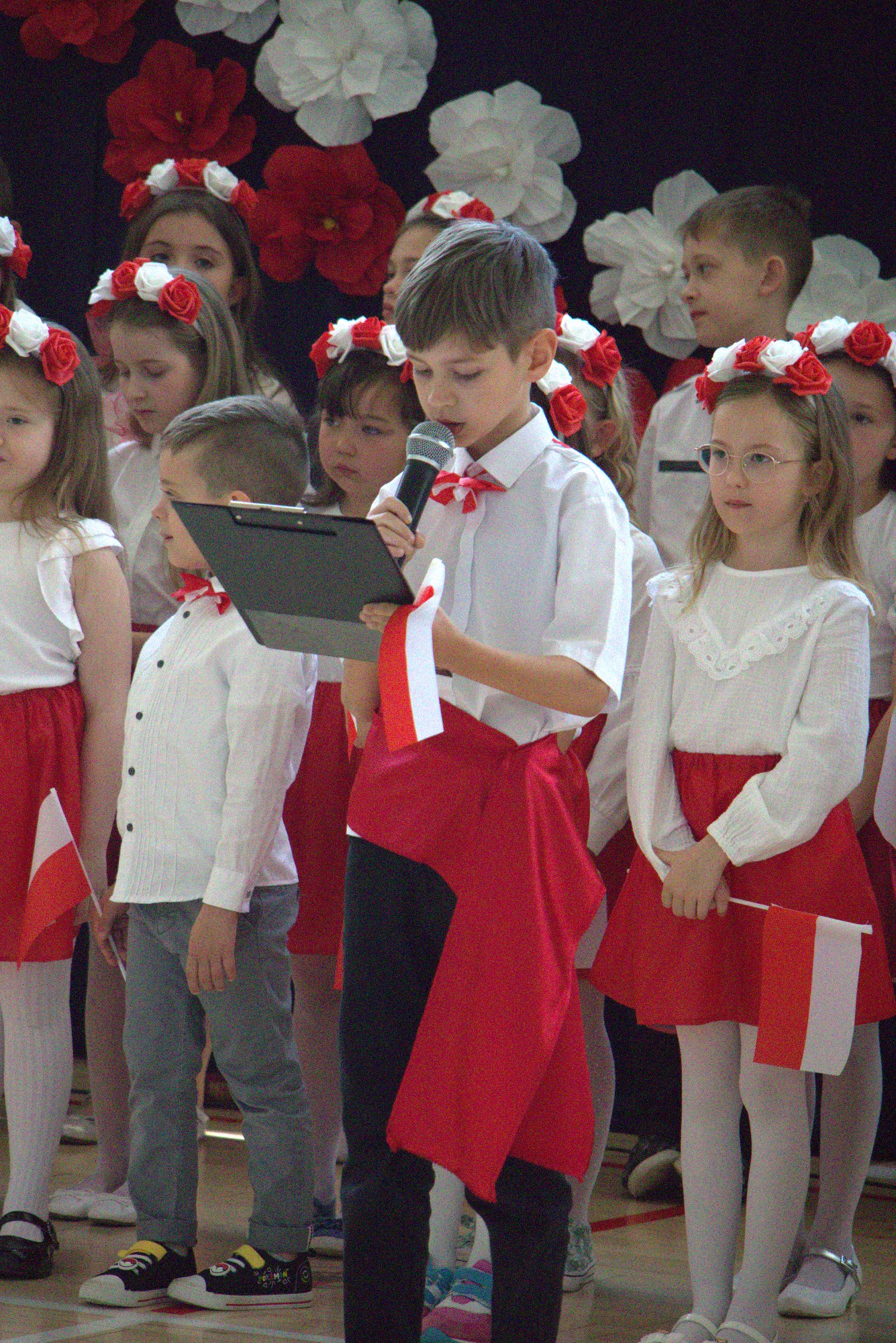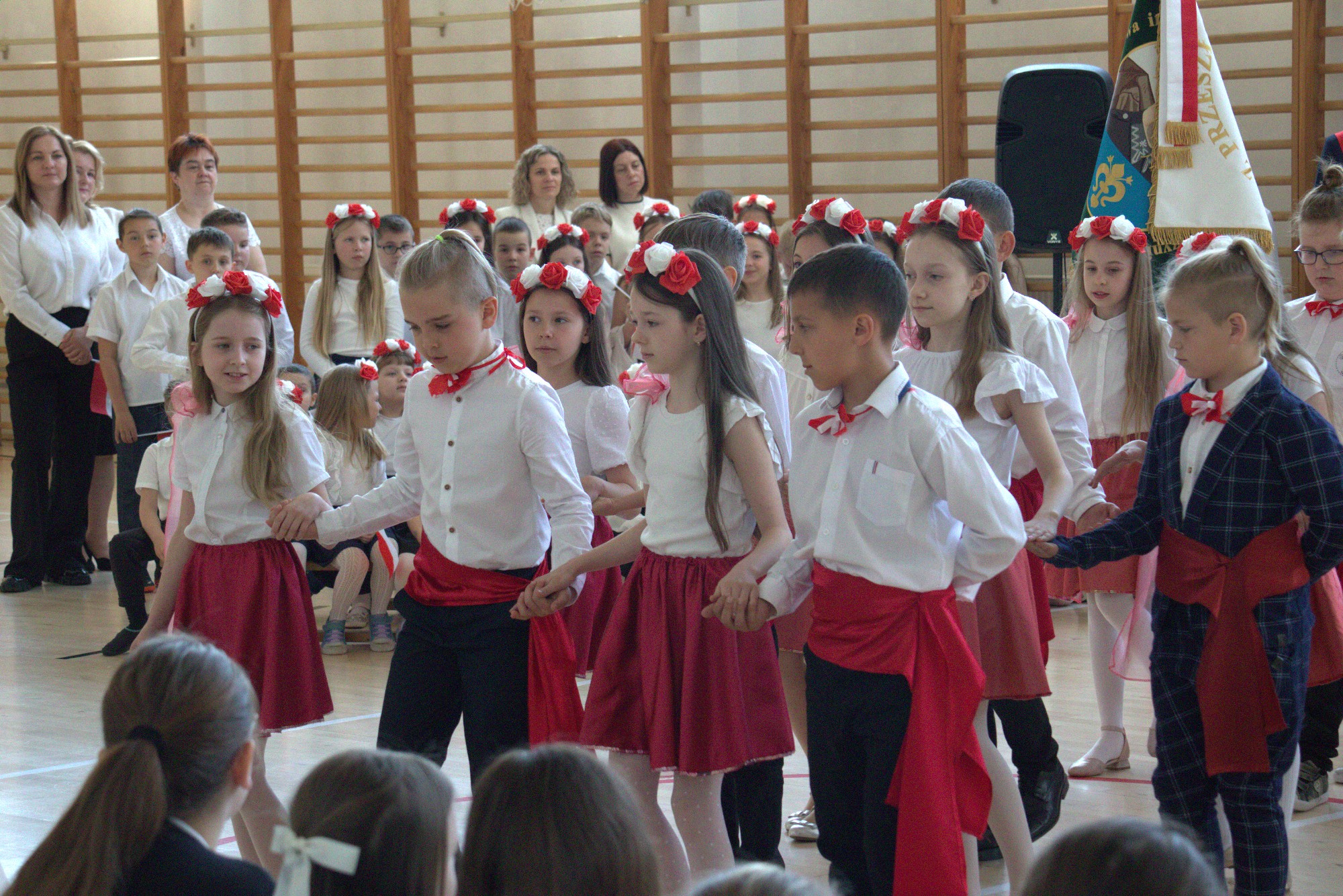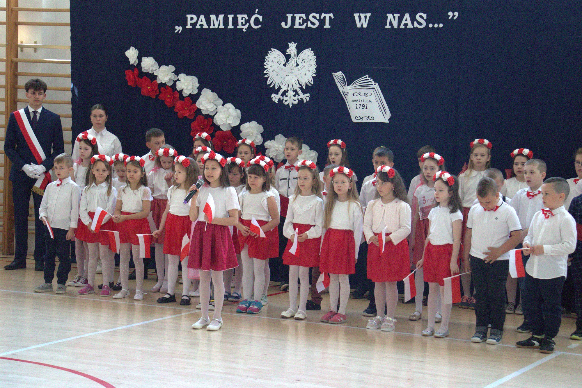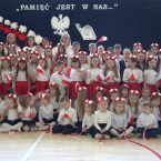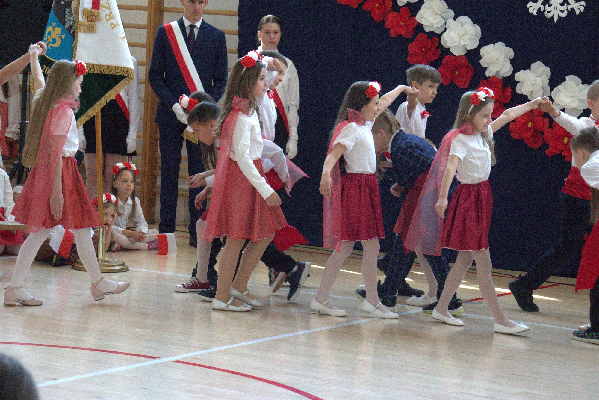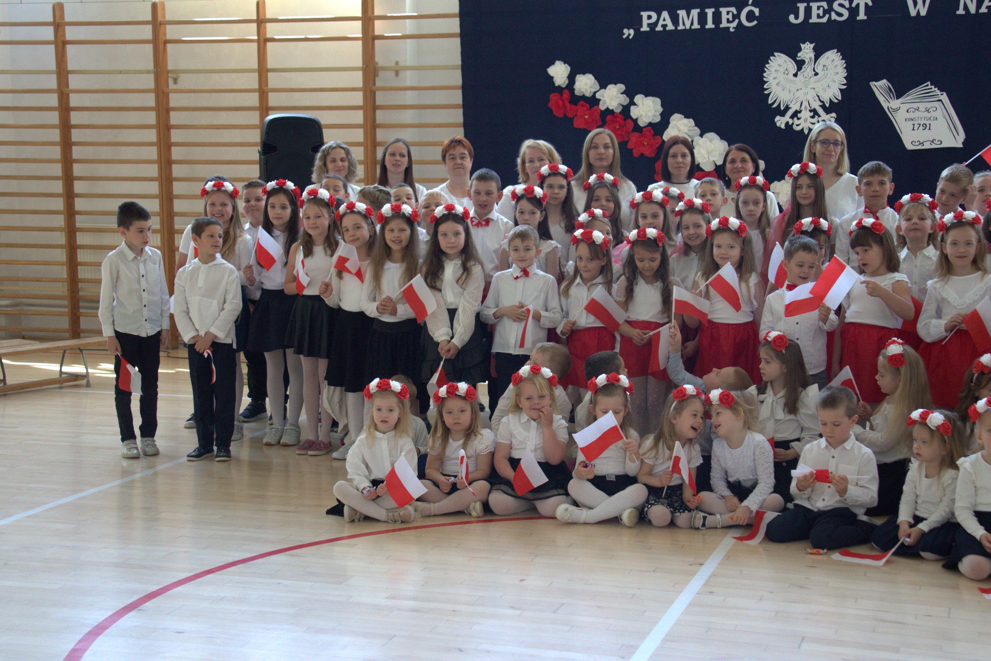 Uczniowie młodszych klas i dzieci z oddziałów przedszkolnych w pięknych strojach z biało – czerwonymi chorągiewkami w ręku demonstrowali swój patriotyzm. Młodzi artyści zaprezentowali wzruszający program artystyczny, w trakcie którego nie zabrakło tematycznych wierszy, wymownych piosenek oraz wspaniale odtańczonego poloneza. Była to niezwykła lekcja historii oraz świadectwo świadomości patriotycznej młodego pokolenia.