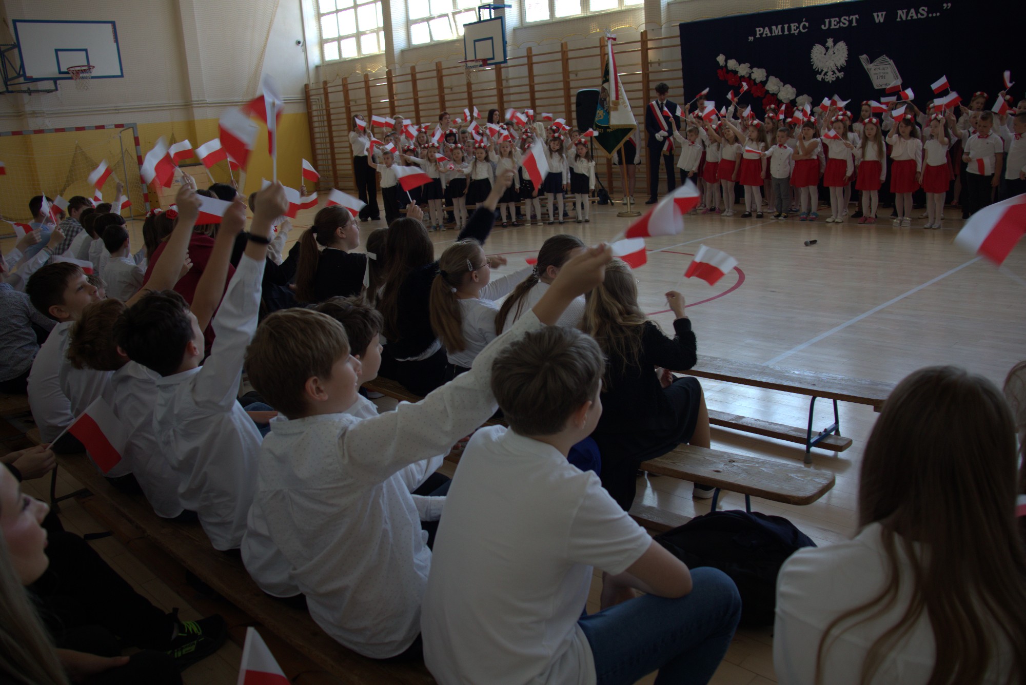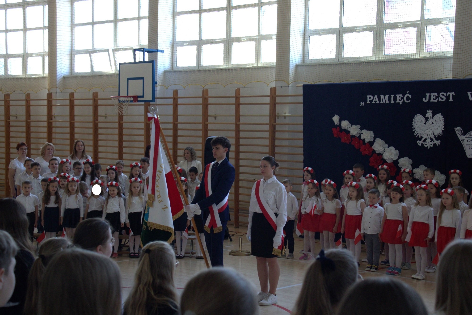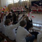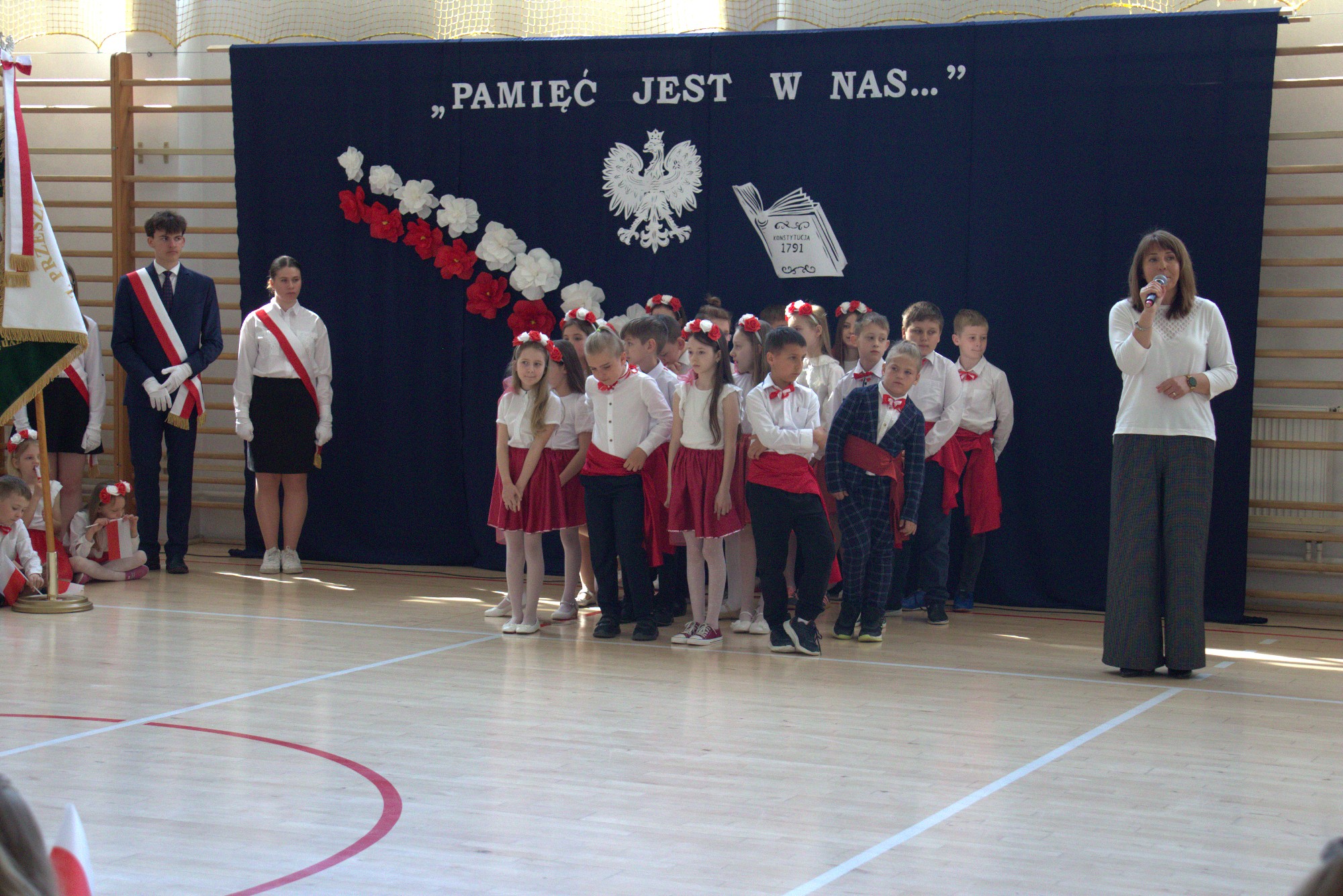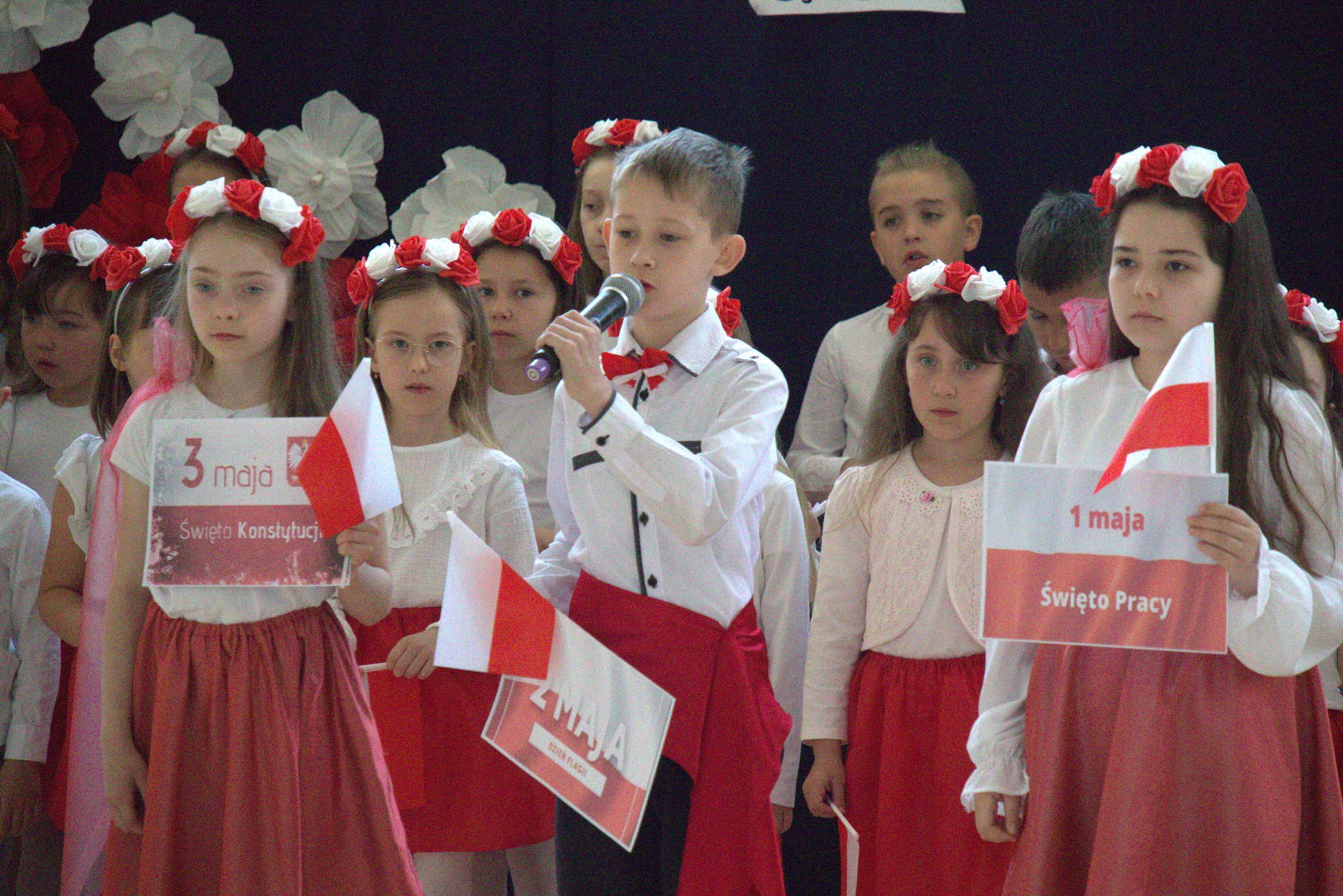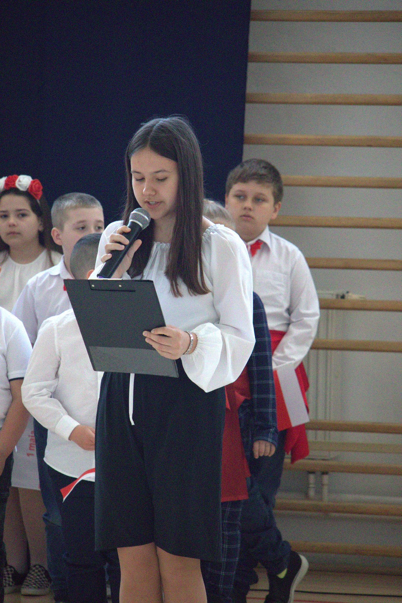 Uczniowie młodszych klas i dzieci z oddziałów przedszkolnych w pięknych strojach z biało – czerwonymi chorągiewkami w ręku demonstrowali swój patriotyzm. Młodzi artyści zaprezentowali wzruszający program artystyczny, w trakcie którego nie zabrakło tematycznych wierszy, wymownych piosenek oraz wspaniale odtańczonego poloneza. Była to niezwykła lekcja historii oraz świadectwo świadomości patriotycznej młodego pokolenia.