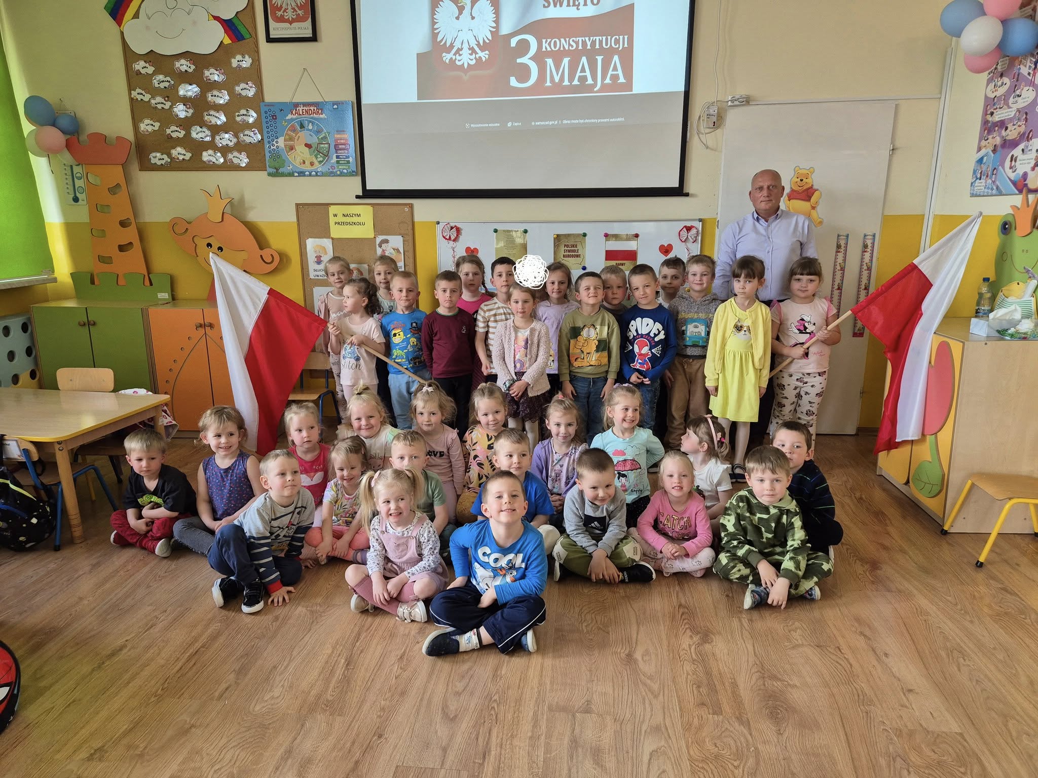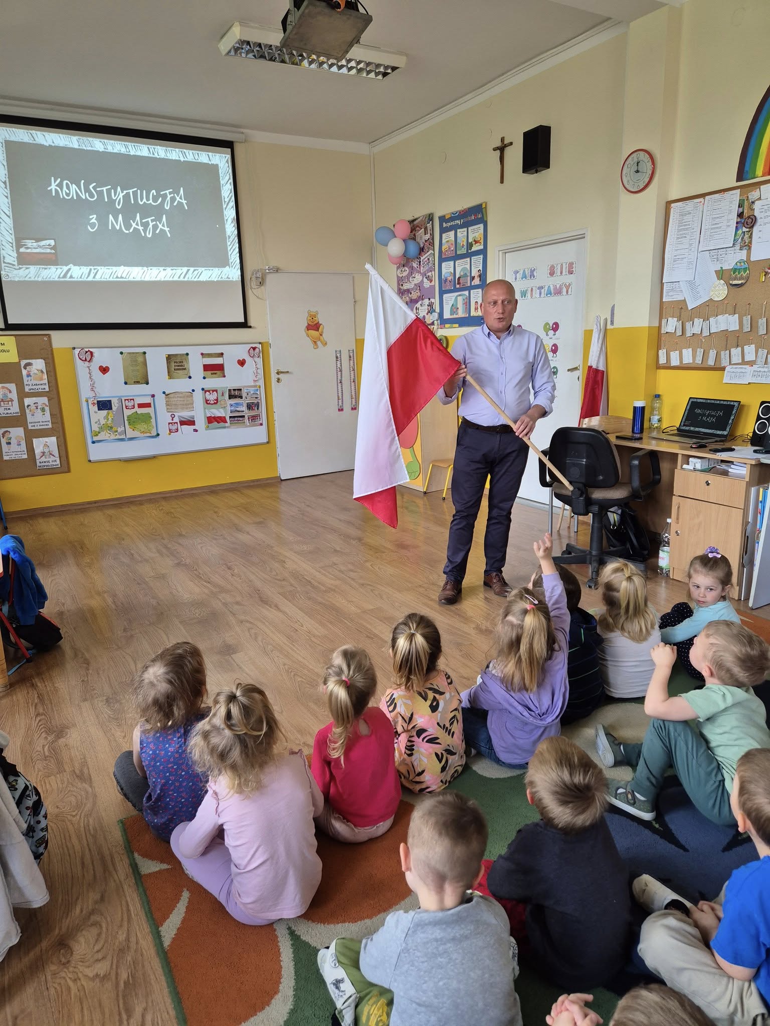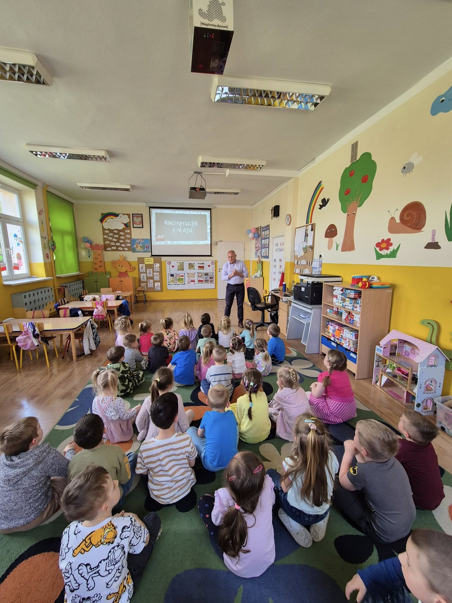 W dniu 30.04.2025r. w oddziałach przedszkolnych 0a i 0b odbyła się lekcja historii przeprowadzona przez historyka Pana Jacka Leszczyńskiego przybliżająca historię świąt majowych z szczególnym uwzględnieniem Rocznicy Konstytucji 3 Maja. Nauczyciel w barwny i ciekawy sposób korzystając z prezentacji multimedialnej przedstawił historię symboli narodowych oraz znaczenie Konstytucji. Dzieci z uwagą słuchały o naszej Ojczyźnie i zachowaniach patriotycznych. Ta lekcja historii na długo pozostanie w pamięci naszych przedszkolaków – małych Polaków.