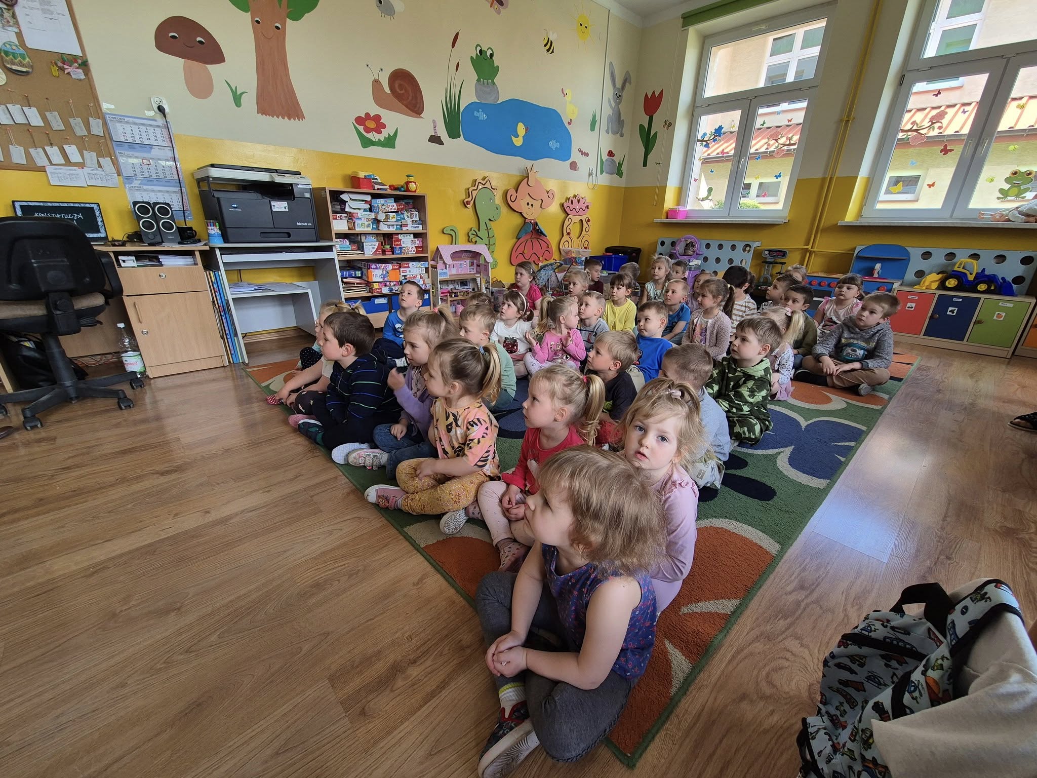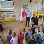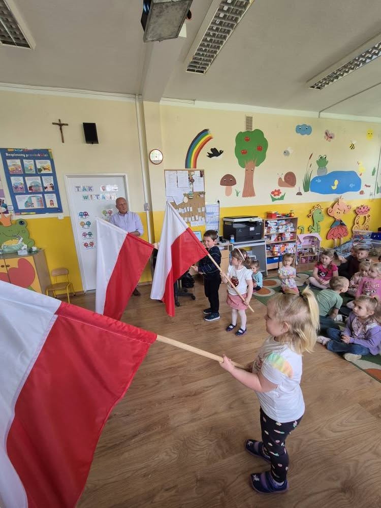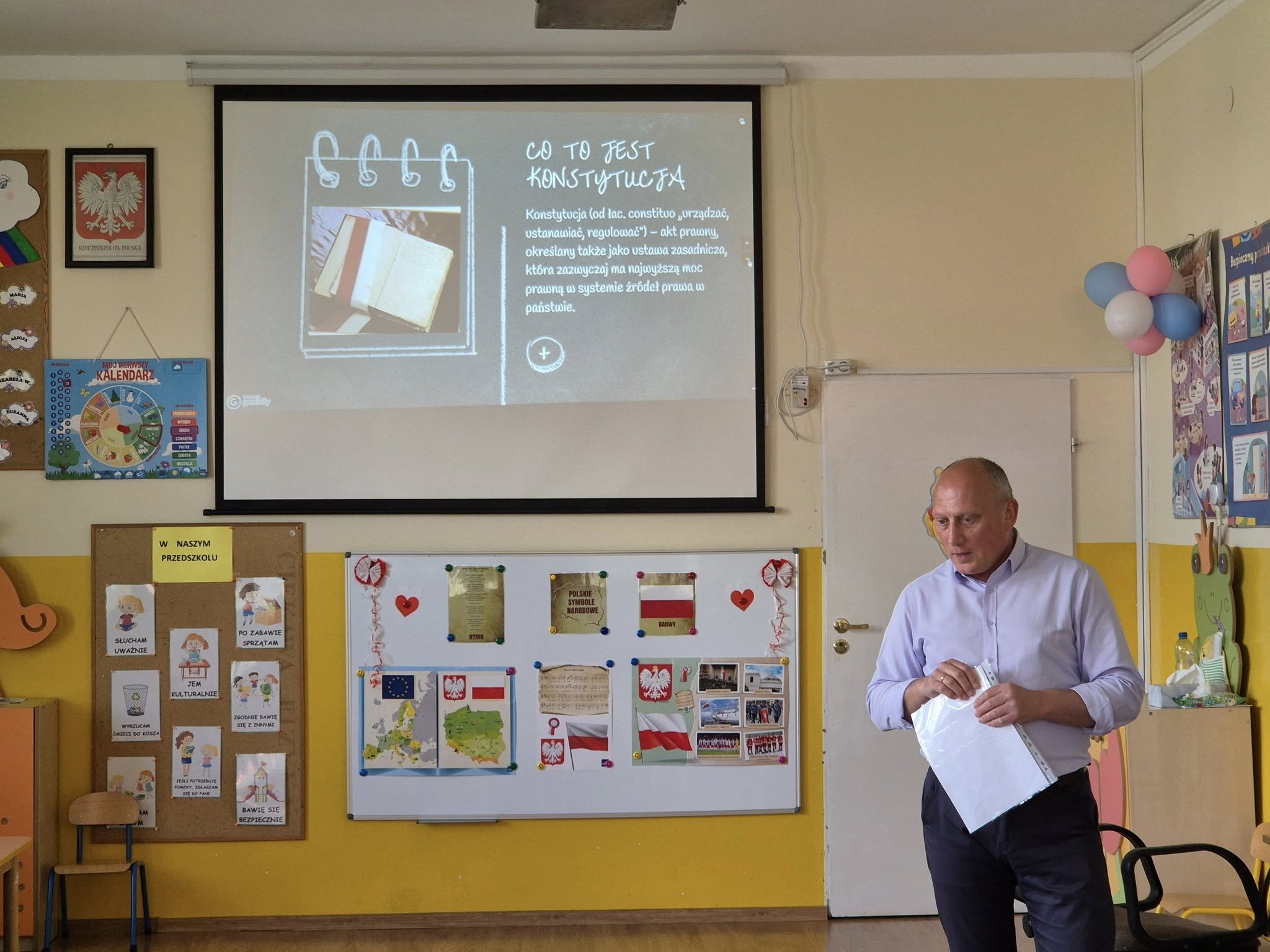 W dniu 30.04.2025r. w oddziałach przedszkolnych 0a i 0b odbyła się lekcja historii przeprowadzona przez historyka Pana Jacka Leszczyńskiego przybliżająca historię świąt majowych z szczególnym uwzględnieniem Rocznicy Konstytucji 3 Maja. Nauczyciel w barwny i ciekawy sposób korzystając z prezentacji multimedialnej przedstawił historię symboli narodowych oraz znaczenie Konstytucji. Dzieci z uwagą słuchały o naszej Ojczyźnie i zachowaniach patriotycznych. Ta lekcja historii na długo pozostanie w pamięci naszych przedszkolaków – małych Polaków.
